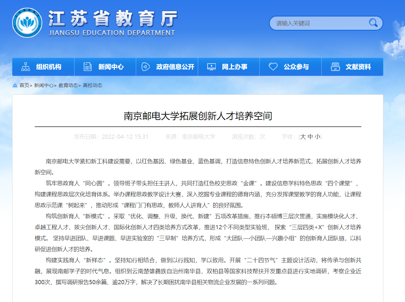 【省教育廳官網】南京郵電大學拓展創新人才培養空間