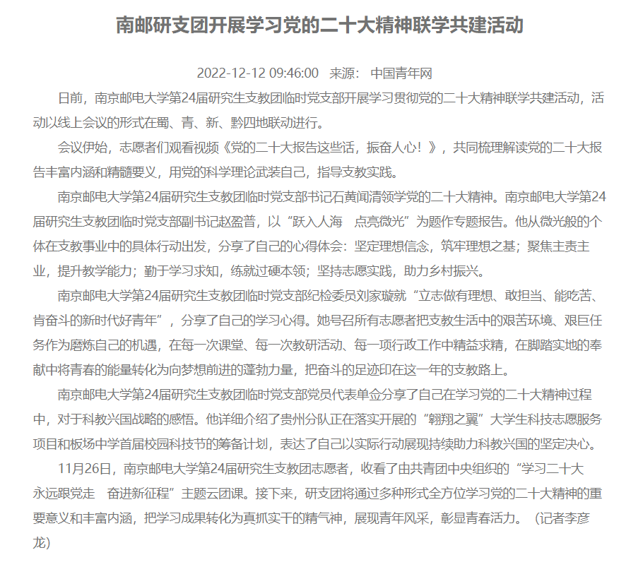 【中國青年網】南郵研支團開展學習黨的二十大精神聯學共建活動