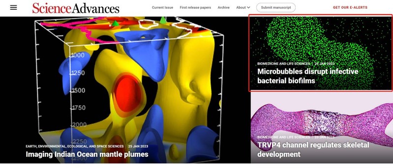 近日,南京郵電大學信息材料與納米技術研究院、有機電子與信息顯示國家重點實驗室汪聯輝教授、宇文力輝副教授和高宇副教授團隊,發展了超聲響應催化微泡用于銅綠假單胞菌慢性肺炎感染的治療。相關成果近期以Ultrasound-responsive catalytic microbubbles enhance biofilm elimination and immune activation to treat chronic lung infections為題發表在國際頂級學術期刊Science Advances(《科學進展》),并入選當期雜志的Featured Image。材料科學與工程學院宇文力輝副教授、高宇副教授、汪聯輝教授為共同通訊作者,博士研究生修尉峻為論文第一作者。