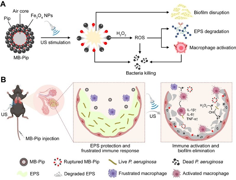 團隊構建了由四氧化三鐵納米顆粒(Fe3O4 NPs)和抗生素哌拉西林(Pip)組成的超聲響應載藥催化微泡(MB-Pip)用于銅綠假單胞菌生物膜的清除。在超聲作用下,MB-Pip產生慣性空化作用,通過機械效應擾亂生物膜結構,釋放的Fe3O4 NPs可催化降解胞外基質,實現物理/化學雙模式的生物膜破壞,有效增強藥物的滲透和抗菌性能。此外,Fe3O4 NPs可激活巨噬細胞向M1表型極化,增強巨噬細胞的殺菌能力,實現小鼠銅綠假單胞菌慢性肺炎的高效治療,為解決臨床細菌生物膜感染難題提供了新的研究思路。