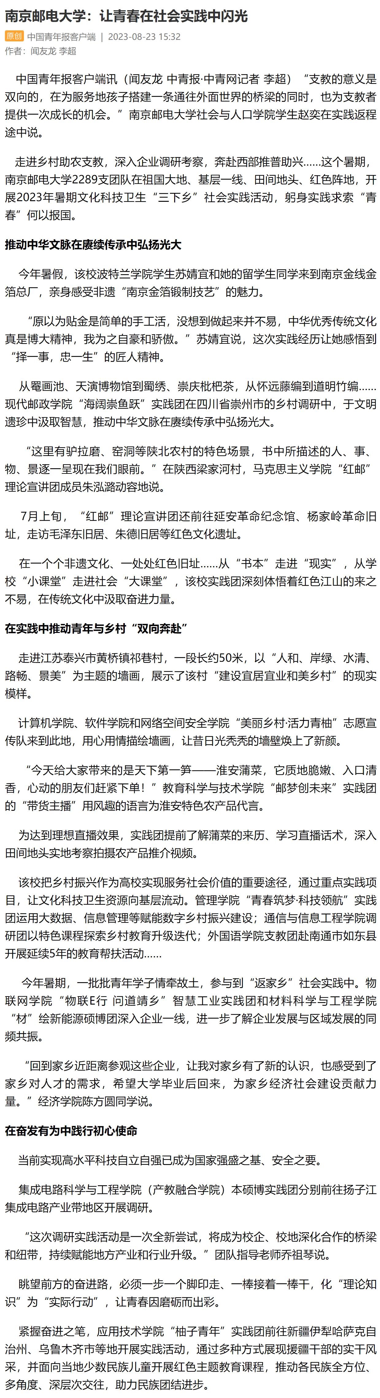 【中國青年報客戶端】南京郵電大學:讓青春在社會實踐中閃光