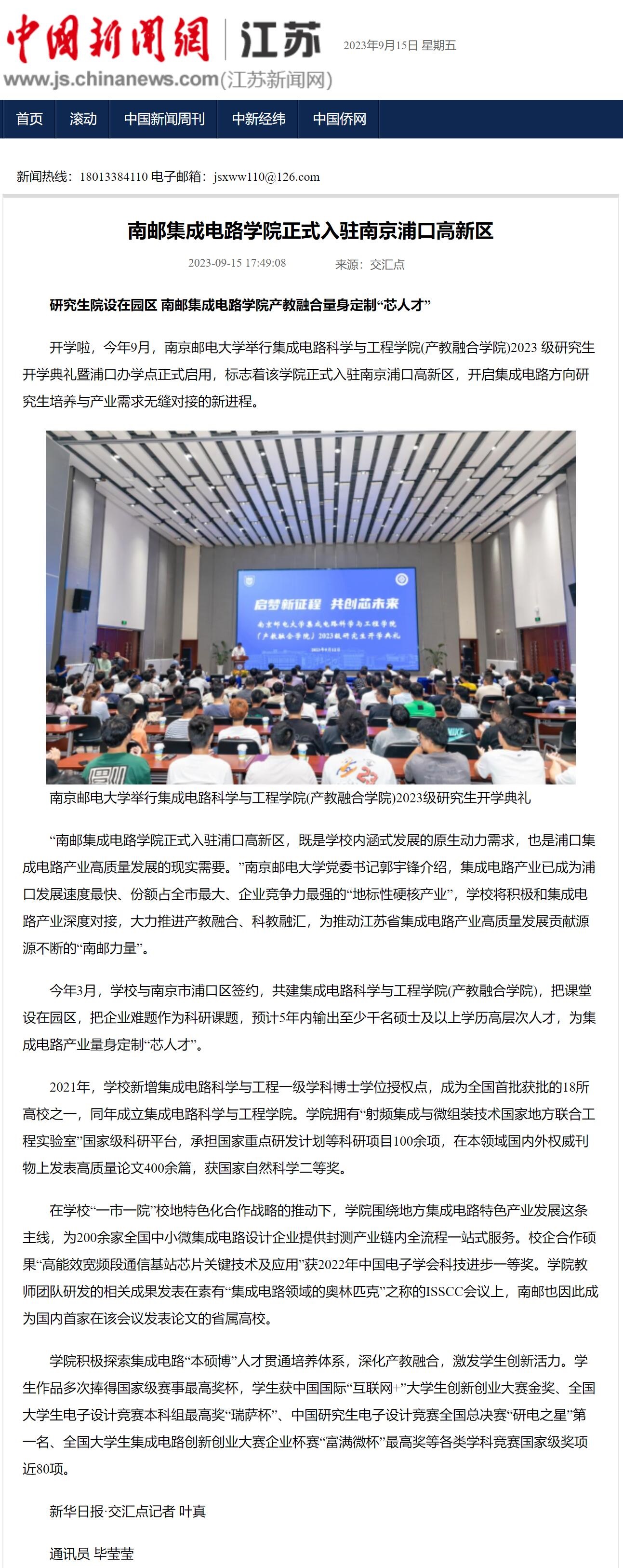 【中國新聞網】南郵集成電路學院正式入駐南京浦口高新區