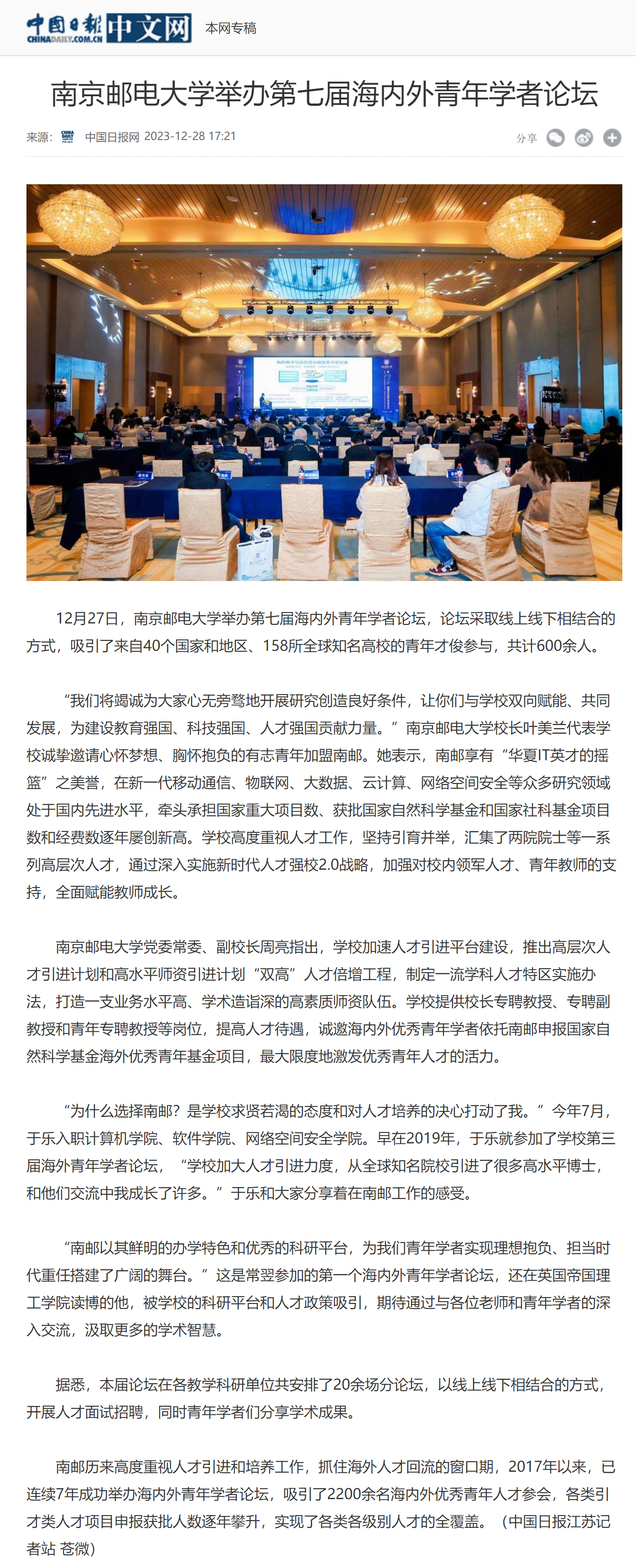 【中國日報中文網】南京郵電大學舉辦第七屆海內外青年學者論壇