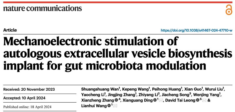 近日,化學(xué)與生命科學(xué)學(xué)院汪聯(lián)輝教授、丁顯光教授與新加坡國立大學(xué)合作,在合成生物學(xué)與無線生物電子領(lǐng)域取得進(jìn)展,相關(guān)成果以“Mechanoelectronic stimulation of autologous extracellular vesicle biosynthesis implant for gut microbiota modulation”為題發(fā)表在國際學(xué)術(shù)期刊Nature Communications上。汪聯(lián)輝教授、丁顯光教授和NUS David Tai leong為共同通訊作者,青年教師萬雙雙為論文第一作者,材料科學(xué)與工程學(xué)院楊文靜教授給予大力支持。