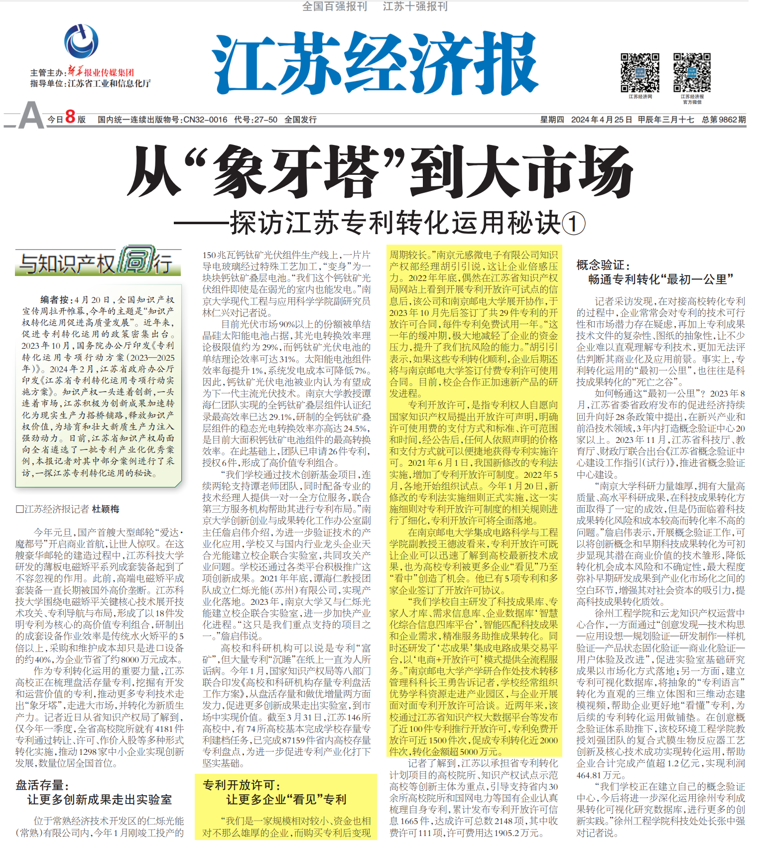 【江蘇經濟報頭版】專利開放許可:讓更多企業“看見”專利