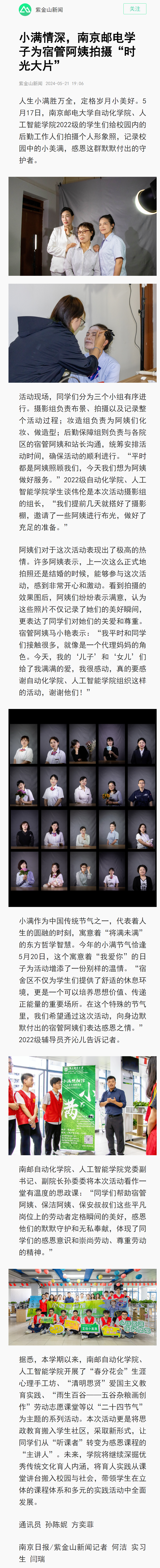 【南京日報客戶端】小滿情深,南京郵電學子為宿管阿姨拍攝“時光大片