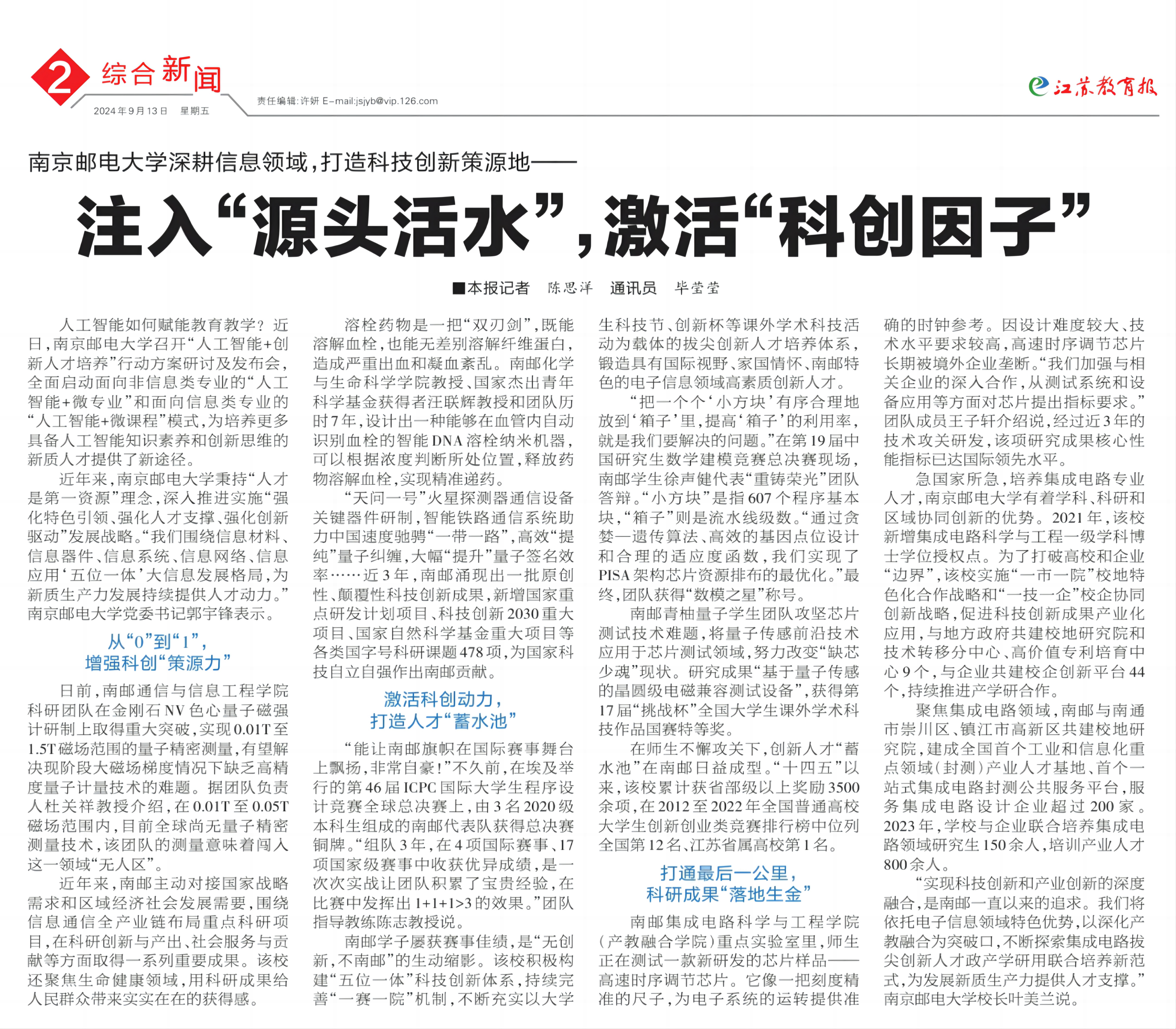 【江蘇教育報】?南京郵電大學深耕信息領域,打造科技創新策源地——注入“源頭活水”,激活“科創因子”
