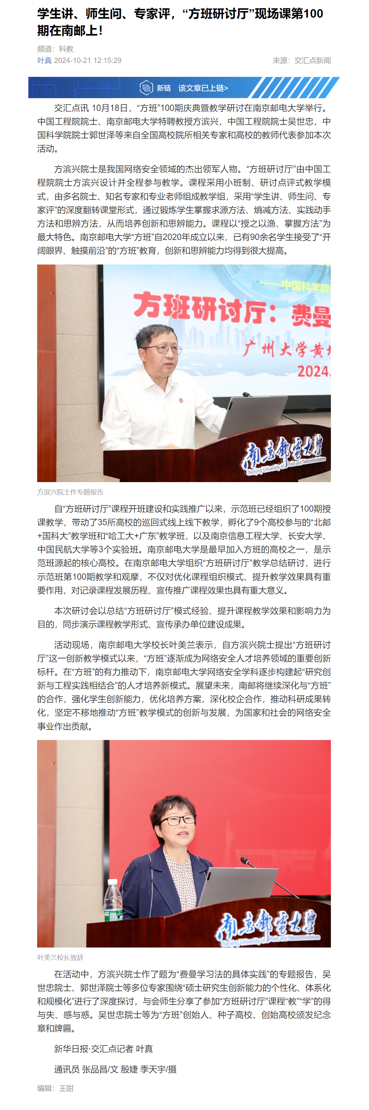 【新華日報客戶端】學生講、師生問、專家評,“方班研討廳”現場課第100期在南郵上!