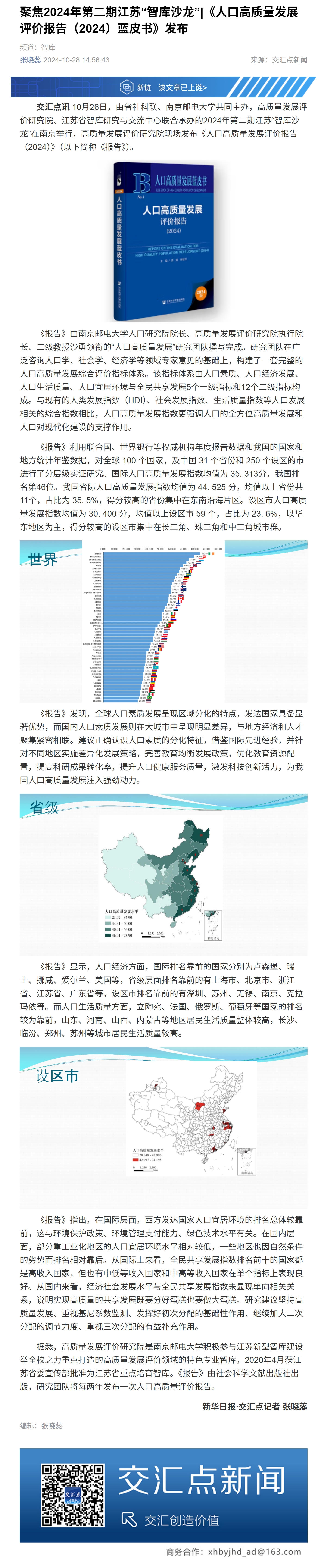 【新華日報客戶端】聚焦2024年第二期江蘇“智庫沙龍”|《人口高質量發展評價報告(2024)藍皮書》發布