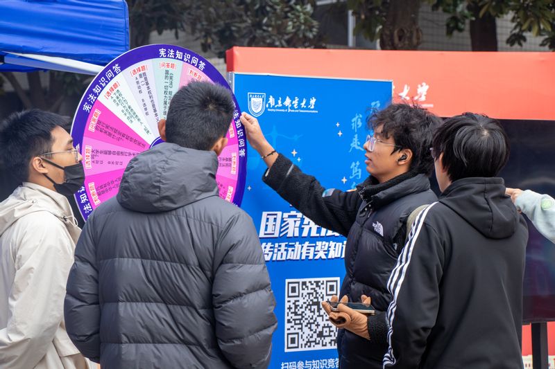 12月3日,由校黨委宣傳部、法制辦公室聯合主辦,電子與光學工程學院、柔性電子(未來技術)學院承辦的“國家憲法日”主題活動在仙林校區南二食堂外場舉行。活動現場,工作人員通過播放憲法宣傳視頻,展示與講解憲法宣傳展板,發放憲法宣傳手冊和普法書籍,提供公益法律咨詢服務,開展“12.4憲法知識競答”“憲法大轉盤”游戲、“我與憲法合照”等方式,向過往師生普及憲法知識,為我校師生帶來一場互動式、零距離的普法新體驗。