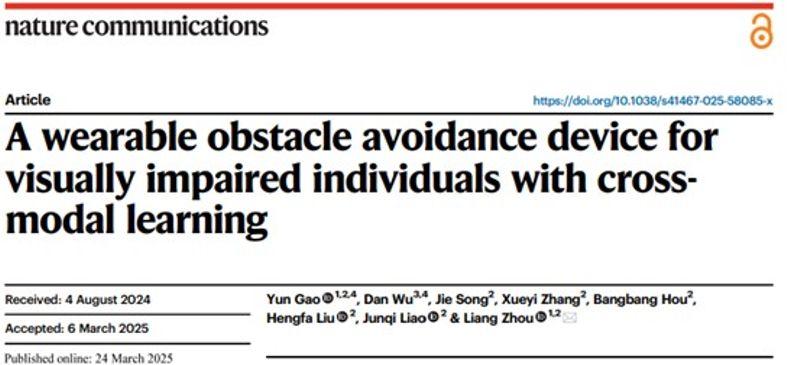 近日,南京郵電大學寬帶無線通信與傳感網技術教育部重點實驗室、通信與信息工程學院青年教師高赟博士,在通信、可穿戴技術、人工智能交叉領域取得最新研究進展。相關研究成果以“A Wearable Obstacle Avoidance Device for Visually Impaired Individuals with Cross-Modal Learning”為題發表于國際學術期刊Nature Communications。該研究聚焦于視障人群輔助出行問題,提出一種融合多模態數據處理與跨模態學習的可穿戴避障設備,顯著提升了出行避障的可靠性、響應速度、續航時間以及用戶友好性。