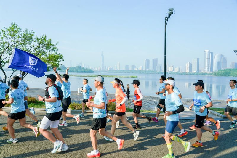 10時30分,葉美蘭校長打響校園跑發令槍。校領導、師生、校友以及中國銀行南京分行、江蘇電信、江蘇移動、江蘇聯通、江蘇鐵塔、江蘇郵政、江蘇有線、聯通物聯、華為、中興、江蘇互聯網協會、嘉環科技、澳江公司、數睿數據、恒隆通信、廣東電信設計院南京分院等企業代表沿著4.2公里的經典路線,途經中博湖、三好亭、戰郵廣場等標志性建筑與景觀,奮力奔跑。