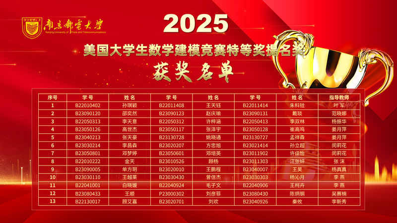 2025年美國大學生數(shù)學建模競賽和跨學科建模競賽結(jié)果近日公布,南京郵電大學獲特等獎(Outstanding Winner)3項,其中2支隊伍兼獲Ben Fusaro Award(本?富薩羅獎)和INFORMS Award,特等獎數(shù)量并列全球第一,這是繼2024年在全國大學生數(shù)學建模競賽中取得大滿貫成績后的新突破。