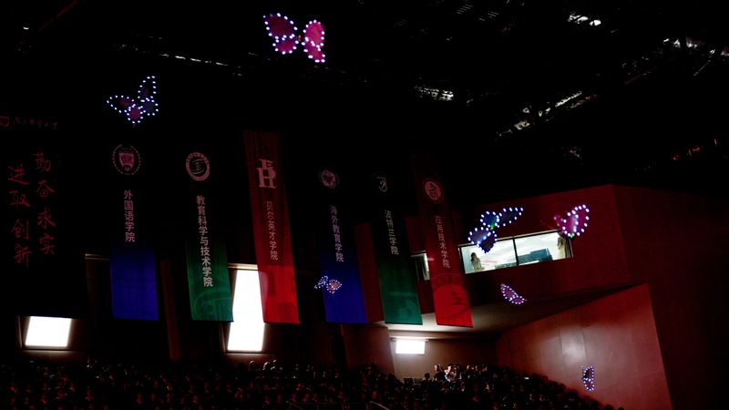 隨著歌聲的息止,體育館內緩緩飄起無數“仿生蝴蝶”,它們靈動起舞,翩躚飛揚,在光影交錯中勾勒出一幅如夢如幻的畫面。大學四年的時光,是一場漫長而深刻的“破繭”之旅,經歷了至關重要的“破繭”時刻,畢業生們終于迎來了振翅欲飛的“成蝶”之姿。“蝴蝶飛呀,飛向未來的城堡,打開夢想的天窗,讓那成長更快更美好……”,希望學子們永遠保持破繭而出的勇氣和探索精神,在新的征程上,繼續舞動青春的翅膀,在理想的天空中自由翱翔,綻放出獨一無二的生命華彩。