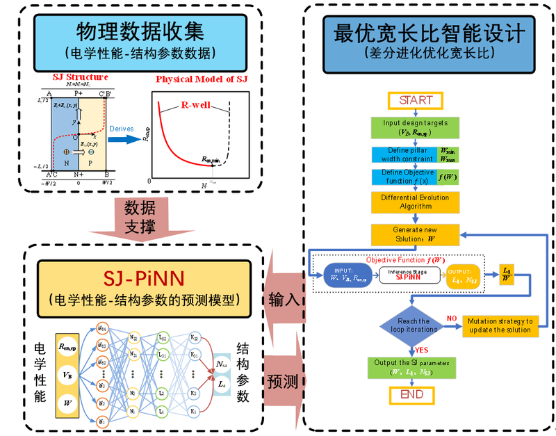 6月1日至5日,南郵郭宇鋒教授團隊在第37屆國際功率半導體器件與集成電路會議(37th International Symposium on Power Semiconductor Devices and ICs, ISPSD 2025)發(fā)表創(chuàng)新研究成果,以第一作者陳靜,通訊作者郭宇鋒完成的Intelligent Design of Superjunction Devices Based on Physics-informed Neural Network被大會收錄。該研究針對傳統(tǒng)設計方案中“人在回路”的局限,提出了超結功率器件物理信息網絡(SJ-PiNN)智能設計方案。基于精確二維電場分析和碰撞電離路徑積分構建的R阱模型生成數據,訓練SJ-PiNN模型實現從性能指標到結構參數的智能預測,并結合差分進化算法,實現任意擊穿電壓與比導通電阻下的最優(yōu)寬長比設計。結果表明SJ-PiNN的R2預測準確率>99.6%,3秒內可生成與數值仿真平均誤差<3%的最優(yōu)寬長比設計,且基于該方案,在CRM 12英寸超結工藝平臺研制出兩個750V超結器件,實測擊穿電壓/比導通電阻平均偏差僅2.4%/5.1%。
