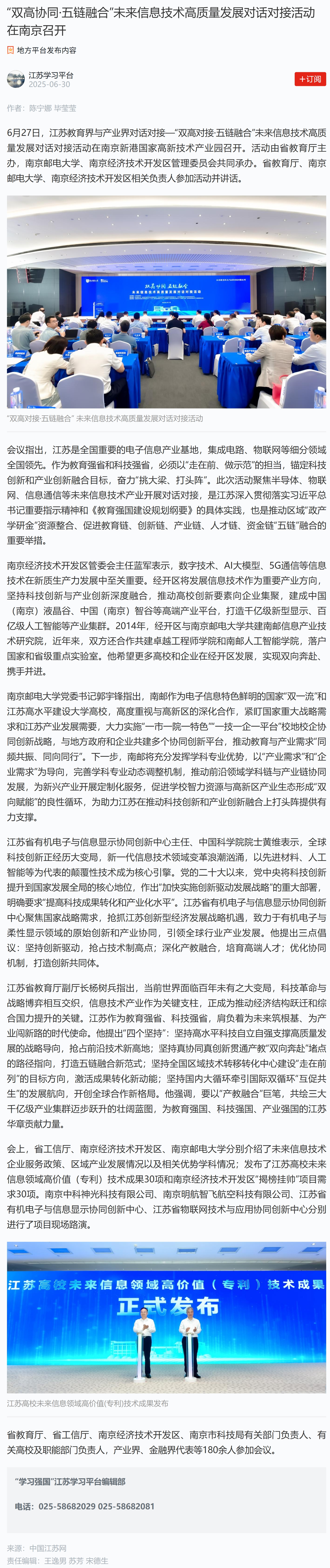 【學習強國】“雙高協同·五鏈融合”未來信息技術高質量發展對話對接活動在南京召開
