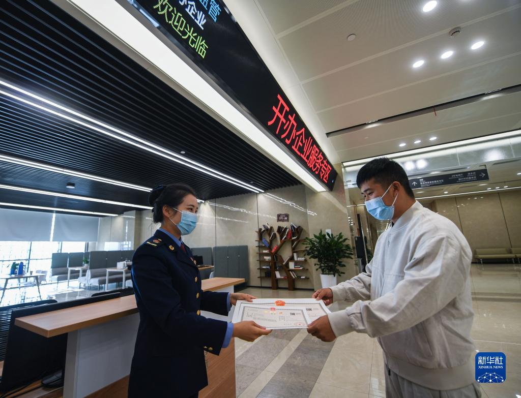 2020年11月10日,在浙江省杭州市臨安區行政服務中心的開辦企業服務專區,蔣先生(右)從工作人員手中接過營業執照。
