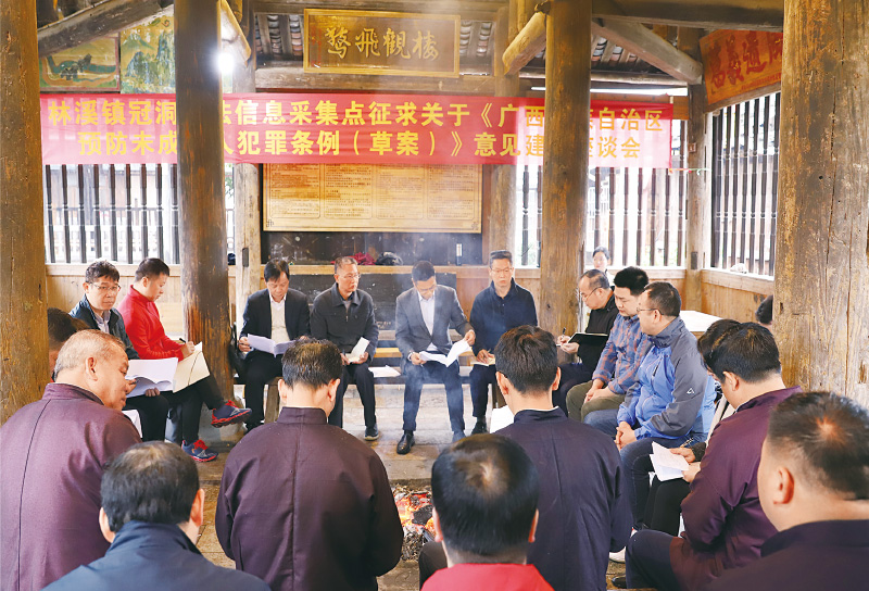 廣西壯族自治區(qū)三江侗族自治縣人大常委會基層立法聯(lián)系點的設(shè)立,密切了當(dāng)?shù)厣贁?shù)民族群眾與國家立法機關(guān)的聯(lián)系,推動了民族地區(qū)民主法治建設(shè)進程,讓百里侗鄉(xiāng)群眾的聲音直通國家立法機關(guān)。圖為當(dāng)?shù)亓⒎?lián)絡(luò)員結(jié)合侗族傳統(tǒng)“鼓樓議事”,使之成為立法聯(lián)系群眾的重要載體。 廣西壯族自治區(qū)三江侗族自治縣人大常委會供圖 覃偉/攝