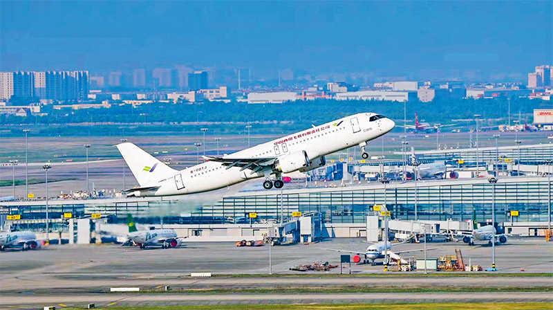 黨的十八大以來,我國創新驅動發展成效明顯,科技實力正在從量的積累邁向質的飛躍,從點的突破邁向系統能力提升。圖為2022年5月14日,編號為B-001J的C919大飛機從上海浦東機場起飛,3小時后安全降落,標志著中國商飛公司即將交付首家用戶的首架C919大飛機首次飛行試驗圓滿完成。