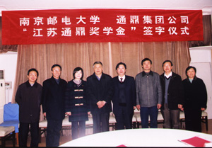 12月7日下午,江蘇通鼎集團公司在南京郵電大學設立“江蘇通鼎獎學金”協議書簽字儀式在我校舉行。校黨委書記、 校長謝玲和通鼎集團公司董事長沈小平分別代表雙方在協議上簽字,副校長唐金土向通鼎集團公司贈送了設獎紀念銅牌,簽 字儀式由校辦主任周南平主持,校相關部門負責人出席了簽字儀式。 根據協議,通鼎集團公司在南京郵電大學設立總額為50萬元人民幣的“江蘇通鼎獎學金”,分五年(2005年—2009 年)每年10萬元用于獎勵品學兼優的全日制在校本科生、研究生。南京郵電大學可組織獲獎學生赴通鼎集團公司參加科學研究 或其它形式的社會實踐活動,根據通鼎集團公司的需要,學校為公司提供員工或客戶培訓,開展相關技術合作。 (校長辦公室)