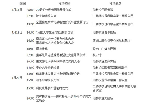 中國江蘇網4月15日訊 記者今天從南京郵電大學了解到,4月20日,該校將迎來辦學70周年慶典,屆時將有多場“重量級”學術交流活動,十幾位兩院院士和一名諾貝爾獎獲得者將作學術報告。 據南京郵電大學黨委宣傳部部長許公全介紹,將有400多位海內外嘉賓和校友應邀參加校慶慶典。十幾位兩院院士將參與一場學術報告會,與學校的各專業師生進行廣泛而深入的學術交流。國內多名大學校長將與來自俄羅斯和美國通信行業相關高校的校長就人才培養問題進行國際交流。據介紹,在校慶期間,南京郵電大學將舉辦150多場學術報告會,其中有校外專家參與的30多場。 校慶期間,南郵大的學生還將有機會與杰出校友進行面對面交流。期間還將舉辦重點中學校長論壇、秦華禮同志塑像揭幕暨校史館開展儀式和科技成果發布暨簽約儀式等多項豐富多彩的活動。 相關鏈接:南郵大校慶周主要活動安排