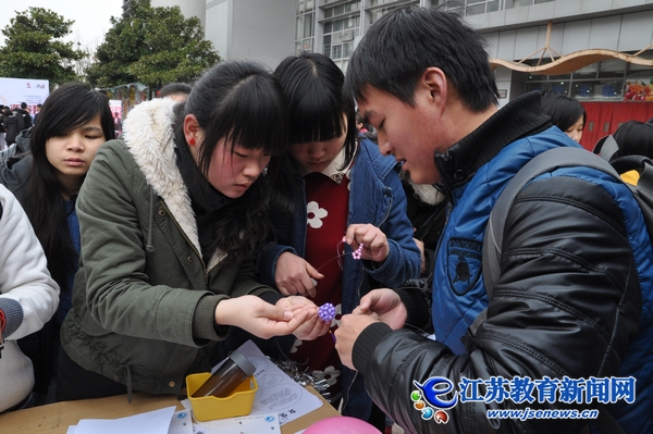 3月7日是女生節,南京郵電大學的女生們在學校的南二廣場用自己的巧手做成串珠、鑰匙扣等一件件小飾品送給過往的同學和老師。在這么一個富有女人味的現場,記者驚奇地發現不少男生的身影。男女搭配,精心編織,美麗的飾品躍然入目。男生的做派,看著似乎不那么“大男人”,卻讓女生別有一份溫情上心頭。 作者:林志龍 張前 |