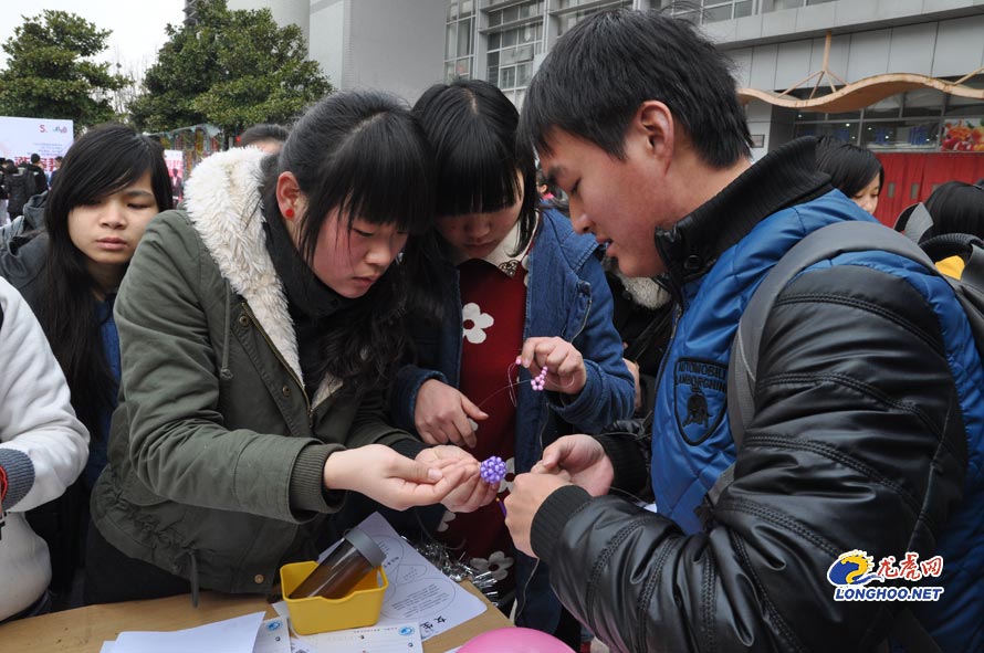 3月7日是女生節,南京郵電大學的女生們在學校的南二廣場用自己的巧手做成串珠、鑰匙扣等一件件小飾品送給過往的同學和老師。在這么一個富有女人味的現場,記者驚奇地發現不少男生的身影。男女搭配,精心編織,美麗的飾品躍然入目。男生的做派,看著似乎不那么“大男人”,卻讓女生別有一份溫情上心頭。
