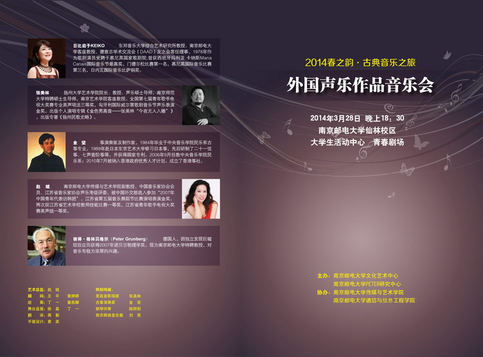 由南京郵電大學文化藝術中心、Peter研究中心主辦,傳媒與藝術學院、通信與信息工程學院承辦的“2014春之韻?古典音樂之旅——外國聲樂作品音樂會”會將于2014年3月28日(周五)下午18:30分在仙林校區大學生活動中心青春劇場舉行。 歡迎廣大師生前來欣賞。 南京郵電大學文化藝術中心 Peter研究中心 2014年3月25日 |