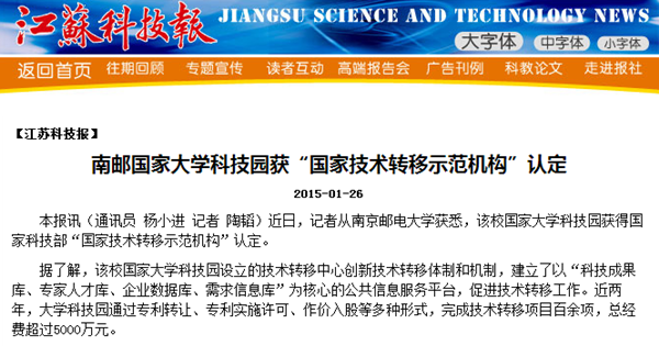 【江蘇科技報】南郵國家大學科技園獲“國家技術轉移示范機構”認定