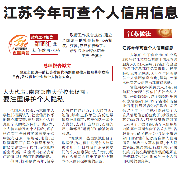 【揚(yáng)子晚報(bào)】江蘇今年可查個(gè)人信用信息