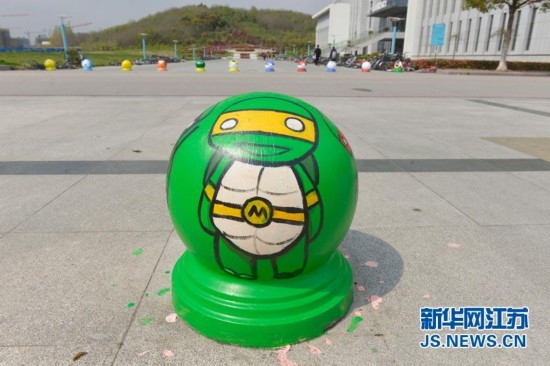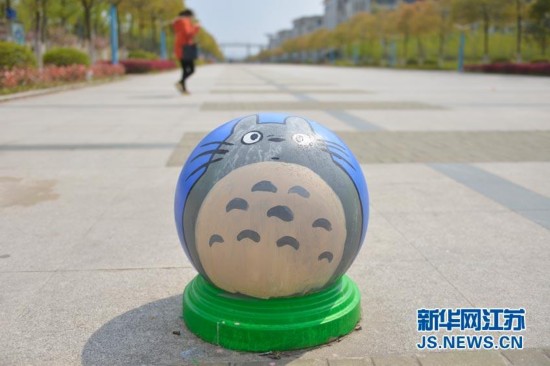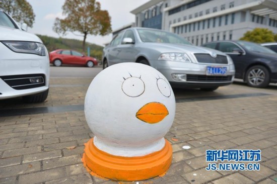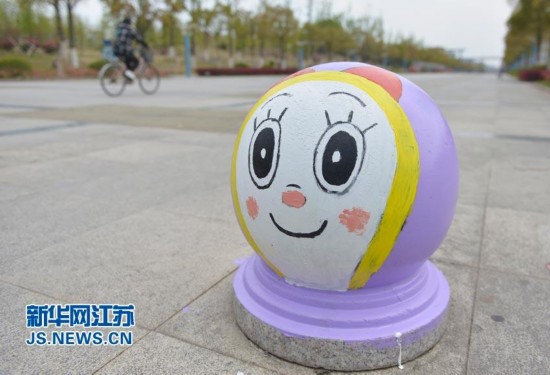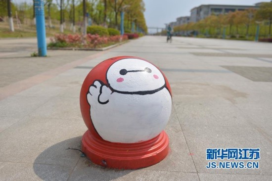 走進南京郵電大學正門,直走約300米就能看到畫有各式“卡通萌寶”的路障球。