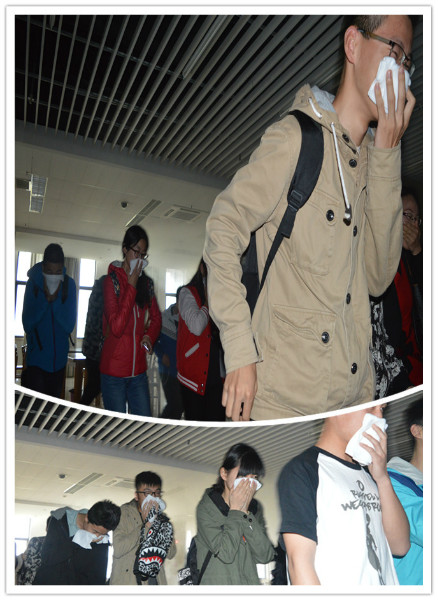 消防疏散注意事項后,現場同學隨大白到三樓自然閱覽室,工作人員按照預案點燃煙餅,火警隨即響起,500多人捂著白毛巾有條不紊的疏散至圖書館一樓西側廣場。