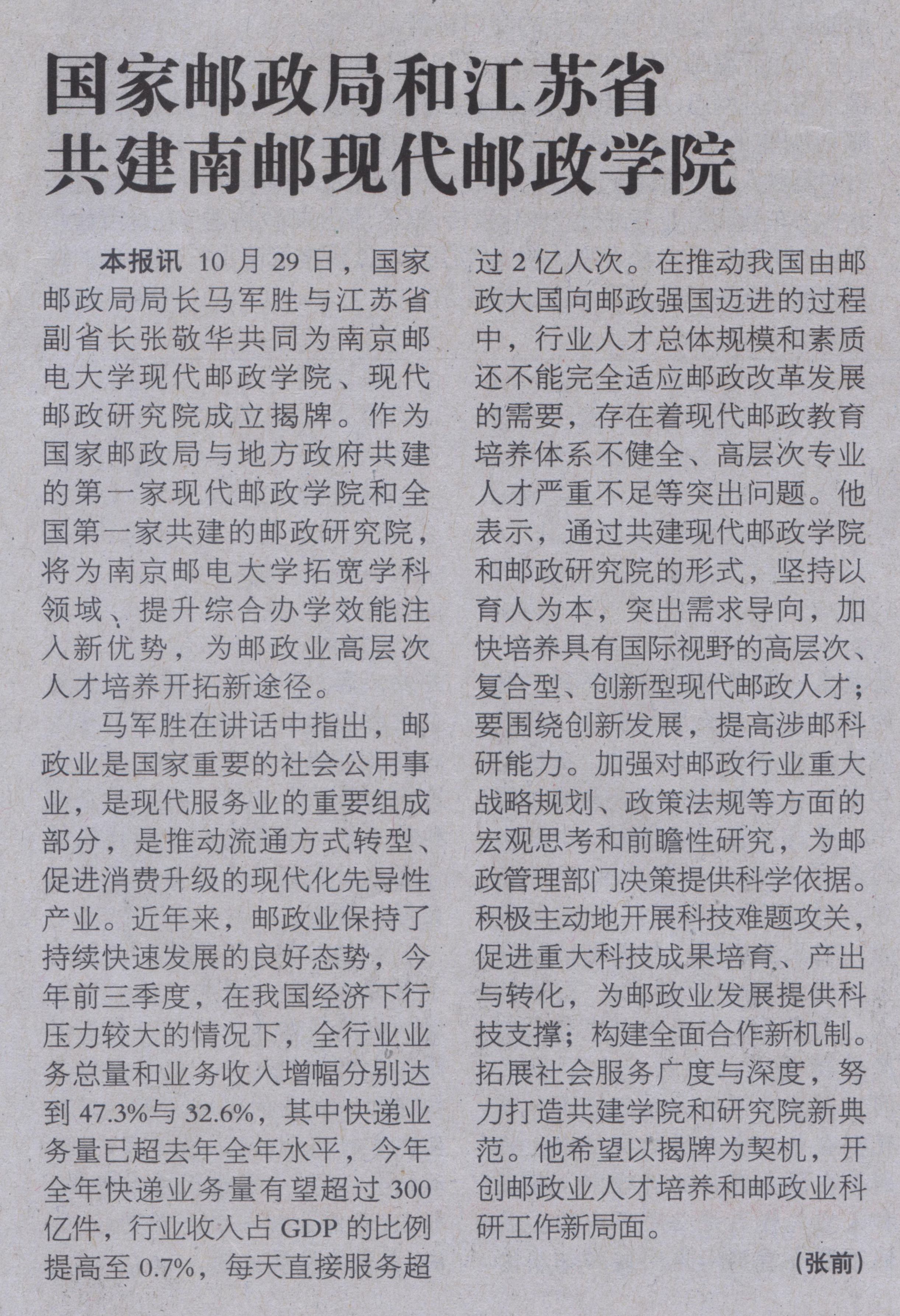 【人民郵電】國家郵政局和江蘇省共建南郵現代郵政學院
