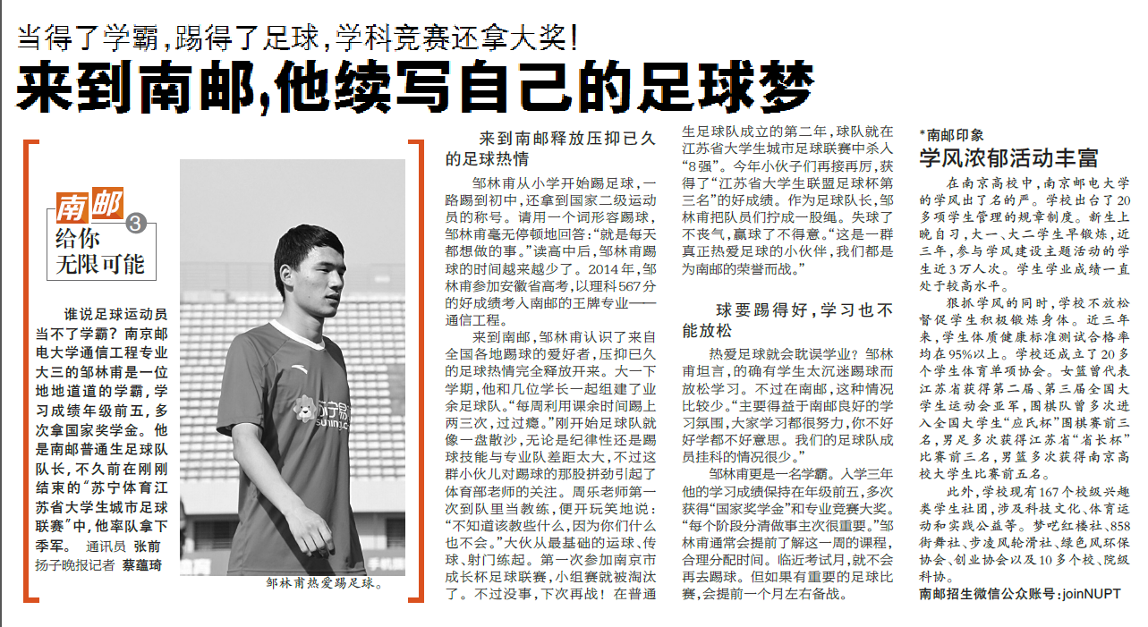 【揚子晚報】來到南郵,他續寫自己的足球夢