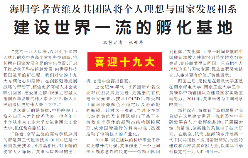 | 【人民日報】海歸學者黃維及其團隊將個人理想與國家發(fā)展相系 建設世界一流的孵化基地 |