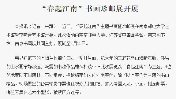 | 【南京日?qǐng)?bào)】“春起江南”書畫珍郵展開展 |