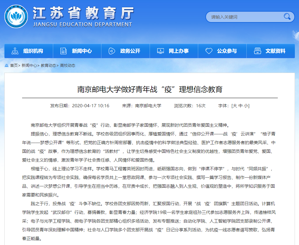 | 【江蘇教育】南京郵電大學做好青年戰(zhàn)“疫”理想信念教育 |