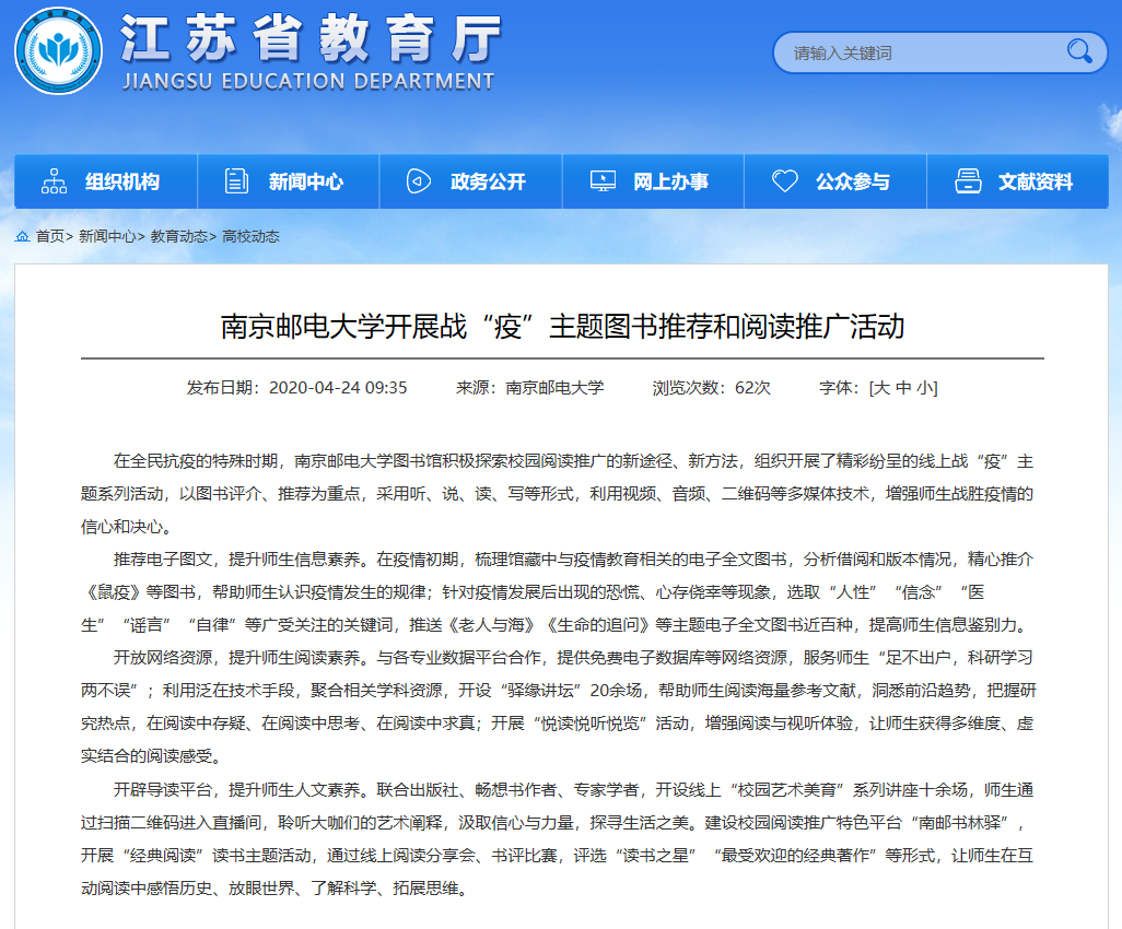| 【江蘇教育】南京郵電大學(xué)開(kāi)展戰(zhàn)“疫”主題圖書(shū)推薦和閱讀推廣活動(dòng) |