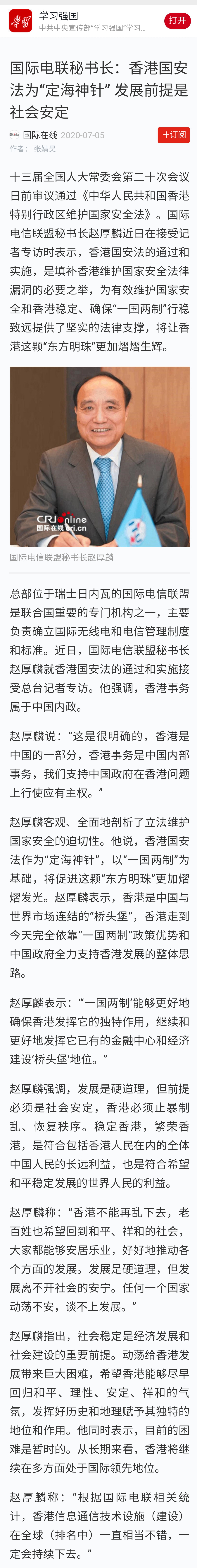 | 【學(xué)習(xí)強(qiáng)國】國際電聯(lián)秘書長:香港國安法為“定海神針” 發(fā)展前提是社會(huì)安定 |