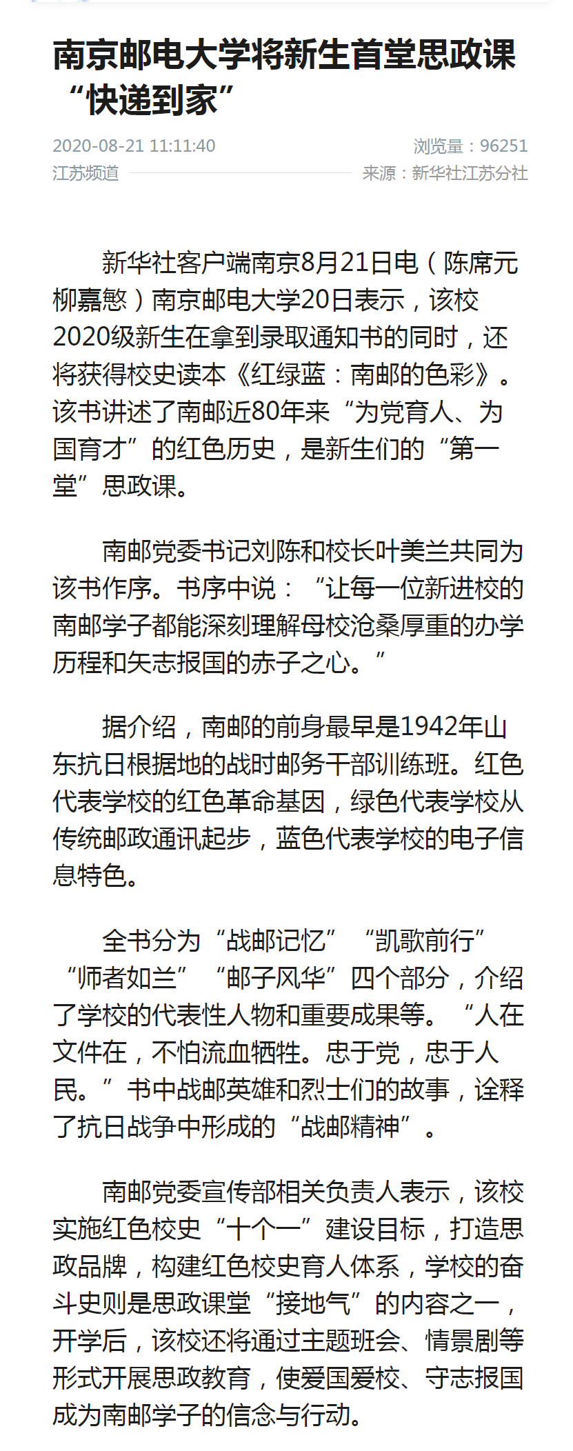 | 【新華社客戶端】南京郵電大學將新生首堂思政課“快遞到家” |