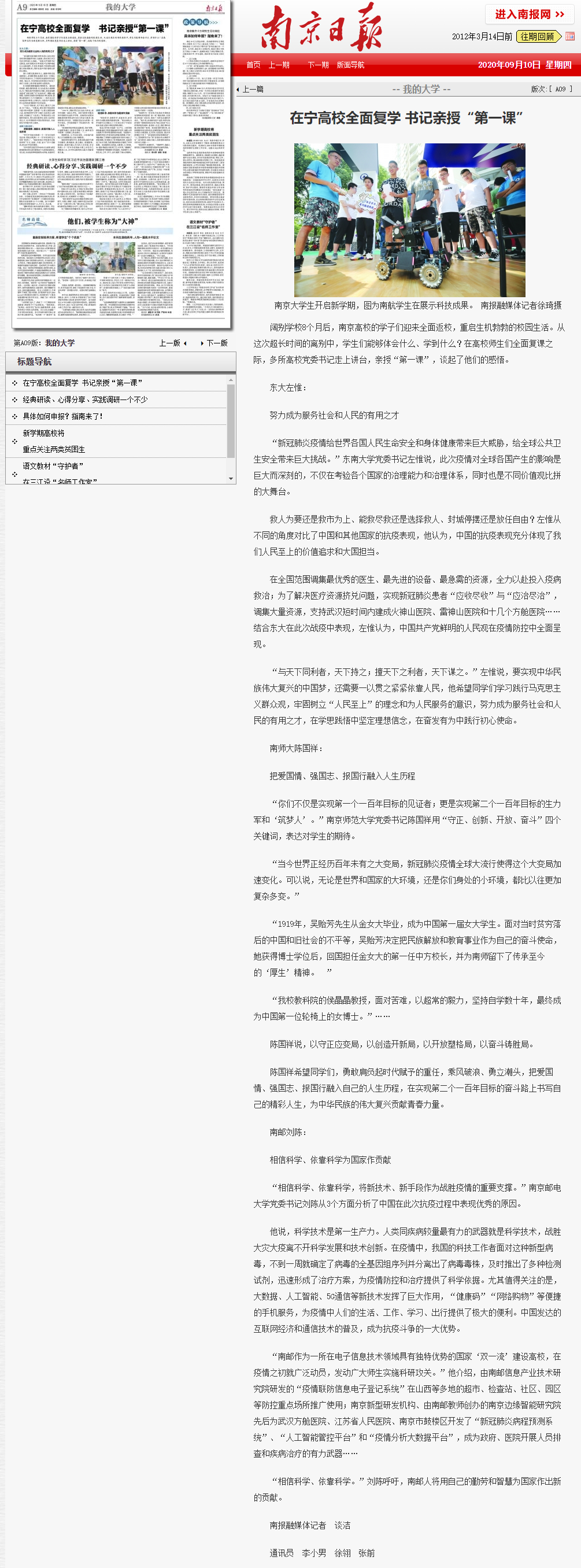 | 【南京日報】在寧高校全面復學 書記親授“第一課” |