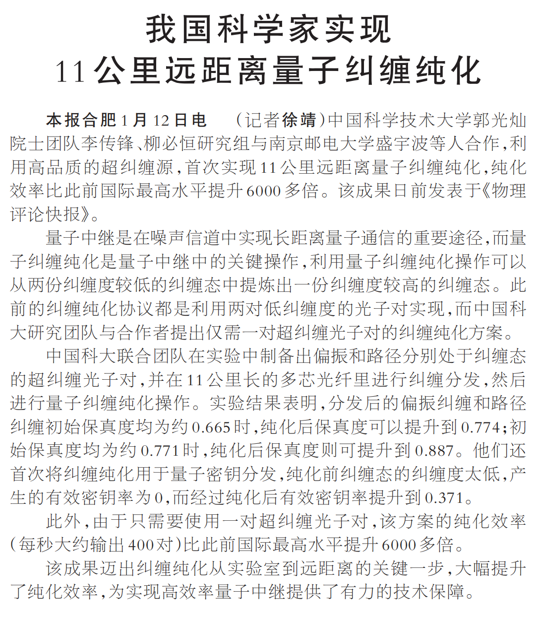 | 【人民日報】我國科學家實現11公里遠距離量子糾纏純化 |