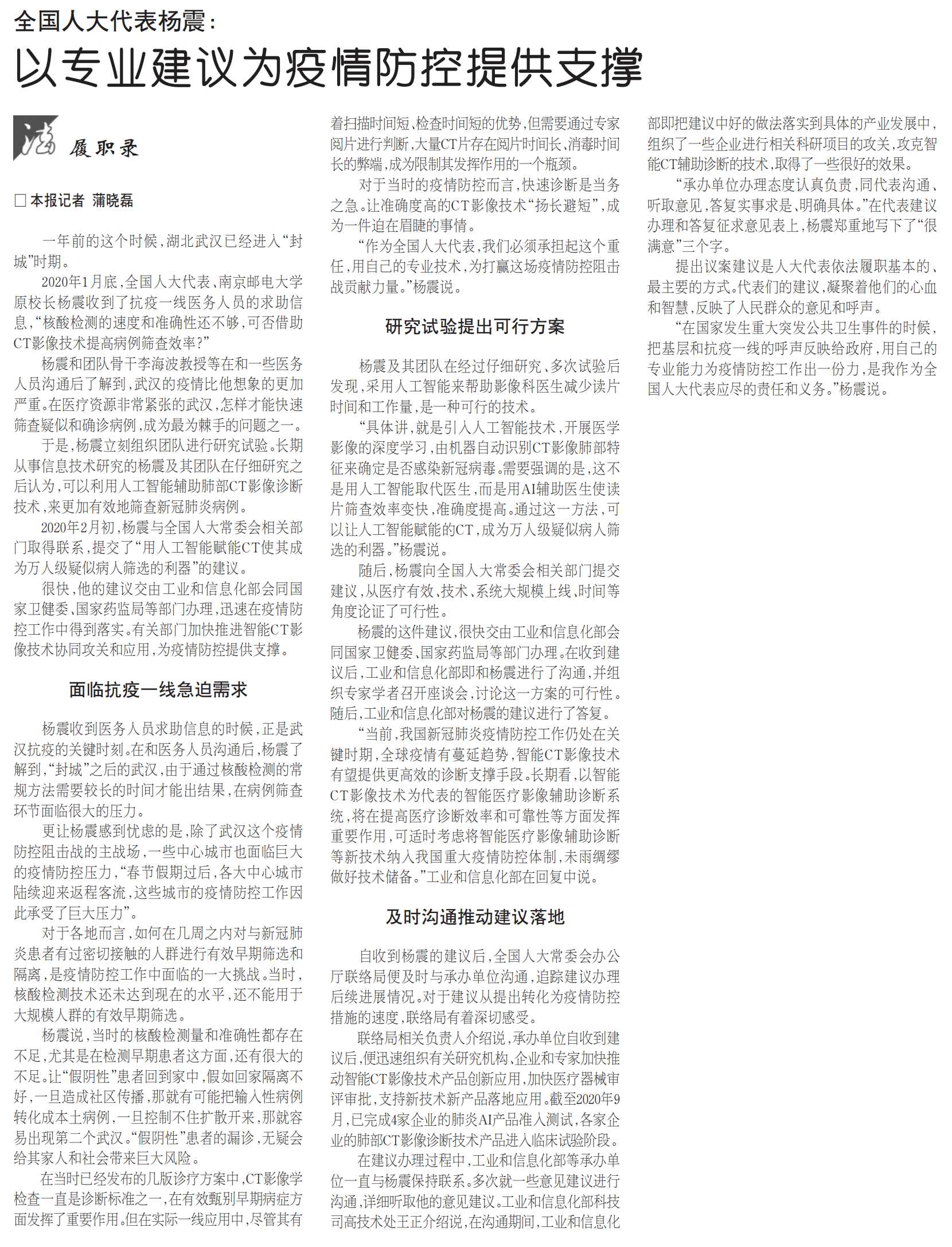 | 【法治日?qǐng)?bào)】全國(guó)人大代表?xiàng)钫穑阂詫I(yè)建議為疫情防控提供支撐 |