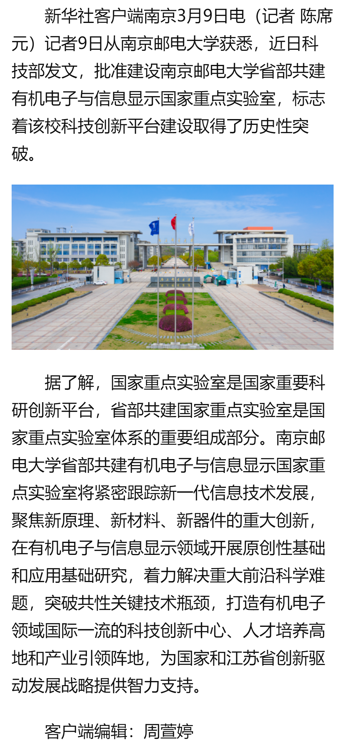 | 【新華社客戶端】南京郵電大學獲批省部共建有機電子與信息顯示國家重點實驗室 |