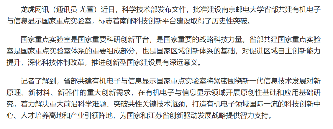 | 【龍虎網】官宣!南郵省部共建有機電子與信息顯示國家重點實驗室獲批 |
