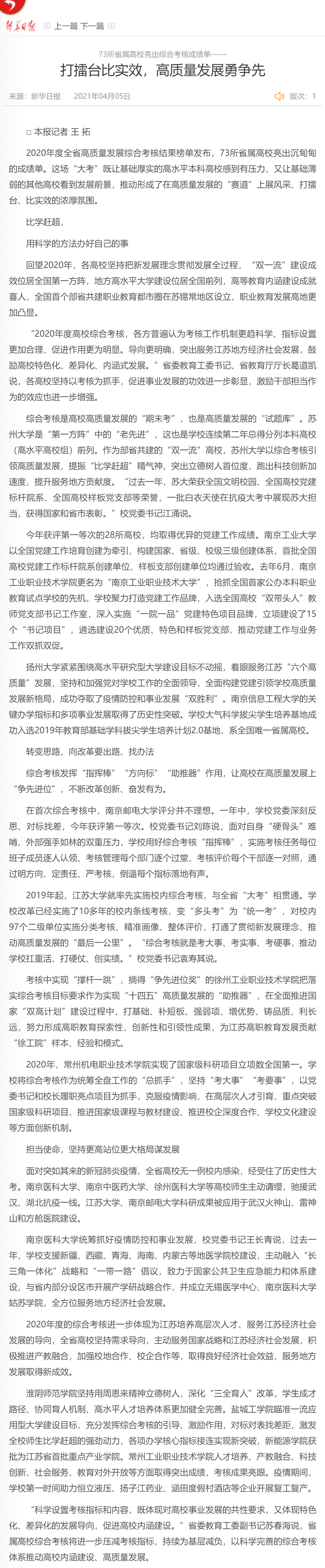 | 【新華日報】73所省屬高校亮出綜合考核成績單——打擂臺比實效,高質(zhì)量發(fā)展勇爭先 |