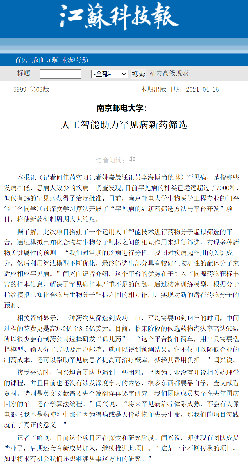 | 【江蘇科技報】南京郵電大學:人工智能助力罕見病新藥篩選 |