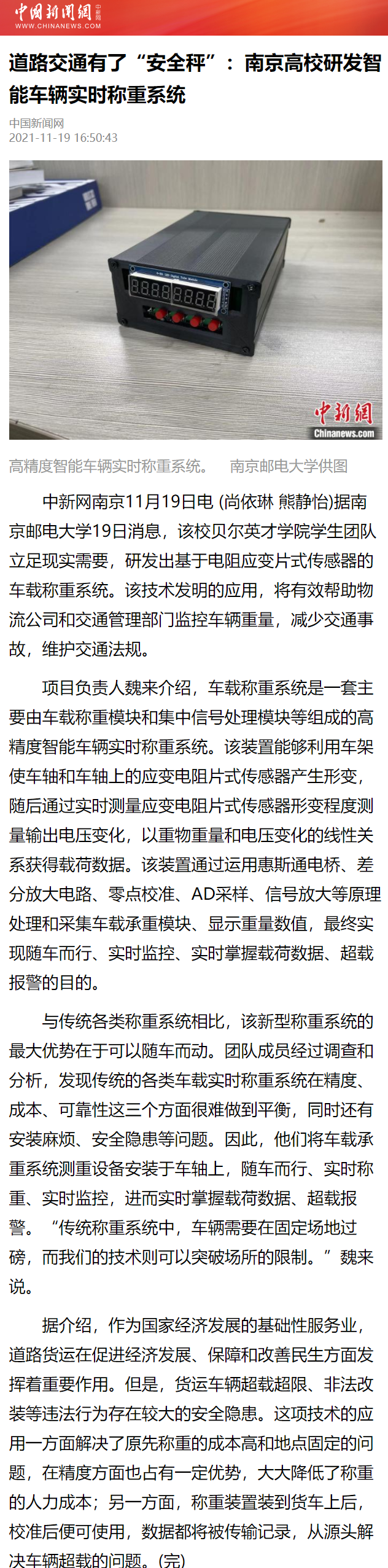 | 【中國新聞網】道路交通有了“安全秤”:南京高校研發智能車輛實時稱重系統 |
