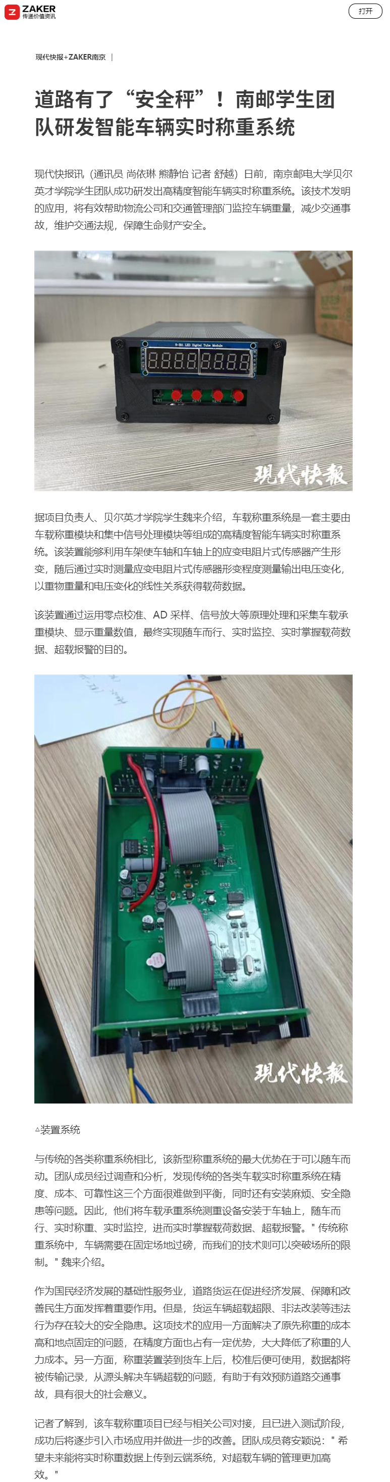 | 【現(xiàn)代快報(bào)全媒體】道路有了“安全秤”!南郵學(xué)生團(tuán)隊(duì)研發(fā)智能車(chē)輛實(shí)時(shí)稱(chēng)重系統(tǒng) |