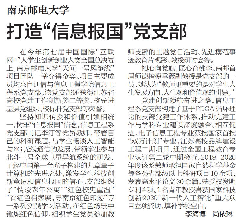 | 【新華日報】南京郵電大學 打造“信息報國”黨支部 |